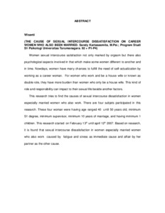 This research tries to find the causes of sexual intercourse dissatisfaction in women especially married women who also work. There are four subjets participated in this research. These four woman were having age ranged 40 until 50 years old, minimum S1 degree, minimum supervisor, minimum 10 years of marriage, and having minimum 1 children. This research started on February 13th until april 12th 2007. Based on research, it is found that sexual intercourse dissatisfaction in women especially married women who also work caused by fatigue and stress as immediate cause and affair by her partner as the other cause.