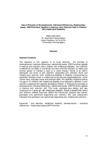 The objective of this research is to study efectivity the principle of developmental, individual differences, relationship-based (DIR/Floortime) applied to improve joint attention skill in children with intellectual disability. Joint attention is defined as the ability to coordinate one owns attention between an object and another person to indicate a need or to share interest. Mundy et al. (2007) distinguish two forms of joint attention: responding joint attention (RJA) and initiating joint attention (IJA). Intellectual disability is disability characterized by significant limitations both in intellectual functioning and adaptivebehavior, which covers many everyday social and practical skills, this disability originates before the age of 18. Children with intellectual disability show delayed or deficient in joint attention compared with typically developing children. In thisstudy,the principle of developmental, individual differences, relationship-based (DIR/Floortime) applied to improve joint attention skill. This study usesingle-case design and was conducted on 4 years girl with intellectual disability. Result indicated that child’s joint attention skillwas improved. Before the intervention program was started, participant only performed responding joint attention. But, post assessment indicated than participant can performed responding and initiating joint attention.