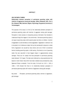 The purpose of this study is to find out the relationship between perception of permissive parenting styles with intention of aggresion among girls teenager. Perception is brain process to interpreting sensory information that intended to understand things that happen in the environment. Permissive parenting styles is one type of parenting styles which parents place few limits on children. Intention of aggression is one’s tendency to show aggression. Aggression is behavior that is intended to hurt individual or object that can be manifested in physical or verbal forms. Aggression can caused by many factors and one of them is situational factors including parenting styles in child rearing. Permissive is one of parenting styles that was assumed to have biggest impact in aggressiveness among teenager. There are 101 subject that have perception of permissive parenting styles between 16-18 ages. The data were collected by using questionaires that based on Likert Scale. Data which have been obtained was processed by using Spearman Brown correlation. From the study, it’s found out r(101) = .022, p (.828) > 0.05 showed that there is no relationship between perception of permissive parenting styles with intention of aggression among girls teenager.