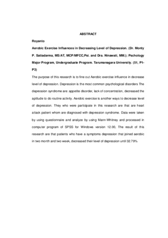 Royanto, Royanto (2007) Pegaruh latihan aerobic pada penurunan tingkat depresi. Skripsi thesis, Universitas Tarumanagara.