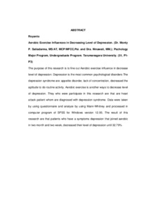 The purpose of this research is to fine out Aerobic exercise influence in decrease level of depression. Depression is the most common psychological disorders The depression syndrome are: appetite disorder, lack of concentration, decreased the aptitude to do routine activity. Aerobic exercise is another ways to decrease level of depression. They who were participate in this research are that are heart attack patient whom are diagnosed with depression syndrome. Data were taken by using questionnaire and analyze by using Mann-Whitney and processed in computer program of SPSS for Windows version 12.00, The result of this research are that patients who have a symptoms depression that joined aerobic in two month and two week, decreased their level of depression until 32.79%
