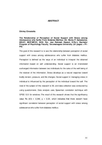 The goal of this research is to see the relationship between perception of social support with stress among adolescence who suffer from diabetes mellitus. Perception is defined as the ways of an individual to interpret the obtained information based on self understanding. Social support is an interrelated exchanged information between two individuals for the sake of the well being of the receiver of the information. Stress develops as a natural response toward bodily tension, pressure, and life changes. Social support in managing stress in individual is influenced by the perception of the individual toward the self. The total of the subject of this research is 93, and data collection was conducted by using questionnaire. Data analysis uses Spearman correlation technique with SPSS 12.0 for windows. The result of this research shows that the significancy value Rs (93) = 0,346, ρ > 0,05, which indicates that there doesn’t have significant correlation between perception of social support with stress among adolescence who suffer from diabetes mellitus.