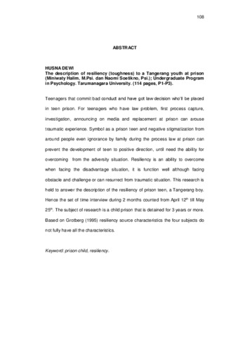 Dewi, Husna (2007) Gambaran potensi resiliensi (ketangguhan) pada anak pidana (studi kasus di Lapas Anak Pria Tangerang). Skripsi thesis, Universitas Tarumanagara.