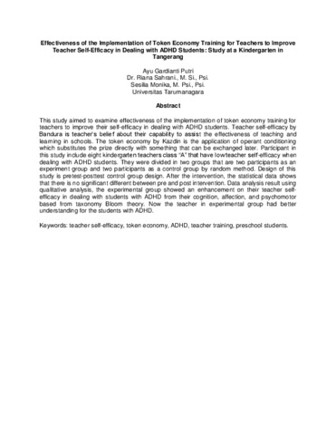 This study aimed to examine effectiveness of the implementation of token economy training for teachers to improve their self-efficacy in dealing with ADHD students. Teacher self-efficacy by Bandura is teacher’s belief about their capability to assist the effectiveness of teaching and learning in schools. The token economy by Kazdin is the application of operant conditioning which substitutes the prize directly with something that can be exchanged later. Participant in this study include eight kindergarten teachers class “A” that have low teacher self-efficacy when dealing with ADHD students. They were divided in two groups that are two participants as an experiment group and two participants as a control group by random method. Design of this study is pretest-posttest control group design. After the intervention, the statistical data shows that there is no significant different between pre and post intervention. Data analysis result using qualitative analysis, the experimental group showed an enhancement on their teacher self-efficacy in dealing with students with ADHD from their cognition, affection, and psychomotor based from taxonomy Bloom theory. Now the teacher in experimental group had better understanding for the students with ADHD.