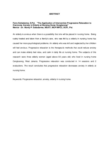 Setiadarma, Ferry (2015) Penerapan intervensi relaksasi progresif dalam mengatasi kecemasan pada lanjut usia di panti werdha cengkareng. Masters thesis, Universitas Tarumanagara.