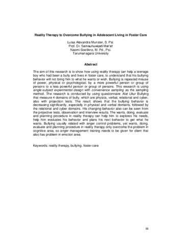 The aim of this research is to show how using reality therapy can help a teenage boy who had been a bully and lives in foster care, to understand that his bullying behavior will not bring him to what he wants or wish. Bullying is repeated misuse of power, physical or psychological, by a more powerful person or group of persons to a less powerful person or group of persons. This research is using single-subject experimental design with convenience sampling as the sampling method. The research is conducted by using questionnaire Alat Ukur Bullying that measure 4 domains of bully, which are physics, verbal, relational and cyber, also with projection tests. The result shows that the bullying behavior is decreasing significantly, especially in physical and verbal domains, followed by the relational and cyber domains. His changing behavior also can be seen from the projective tests, observation and interview results. The wants, doing, evaluate and planning procedure in reality therapy can help him to explores his needs, help him evaluates his behavior and plans his next behavior to get what he wants. Bullying usually related with anger control problems, yet wants, doing, evaluate and planning procedure in reality therapy only overcome the problem in cognitive area, so anger management training needs to be given for client that also has problem in emotion area.