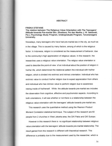 S., Friska (2001) Hubungan antara orientasi nilai religius dengan sikap remaja terhadap hubungan seks pranikah. Skripsi thesis, Universitas Tarumanagara.