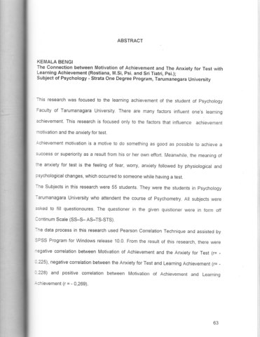 "This research was focused to the learning achievement of the student of Psychology Faculty of Tarumanagara University. There are many factors influent one's learning achievement. This research is focused only to the factors that influence achievement motivation and the anxiety for test.