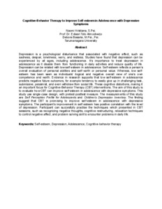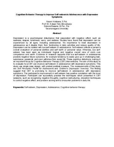 Depression is a psychological disturbance that associated with negative affect, such as sadness, despair, loneliness, worry, and restless. Studies have found that depression can be experienced by all ages, including adolescence. It’s importance to treat depression in adolescence as it disable them from functioning in daily activities and reduce quality of life. Depression can be related with low self-esteem in adolescence. Self-esteem reflects a person’s overall evaluation of personal abilities and self-worth or personal value. Whereas, low self-esteem has been seen as individuals’ ilogical and negative overall view of one’s own competence and worth. Evidence in research supports that low self-esteem in adolescence predicts negative future outcomes, for example tendency to easily give up in challenging task, submissive, pessimist, and even withdraw from social life. These cognitive distortions, making it an important focus for Cognitive-Behavior Therapy (CBT) interventions. The aim of this study is to evaluate how CBT can improve self-esteem in adolescence with depressive symptoms. This study use single-case design, with pretest-posttest measure. The measurements of this study are Self Perception Profile for Adolescents and Children’s Depression Inventory. The finding suggest that CBT is promising to improve self-esteem in adolescence with depressive symptoms. The participant’s improvement in self-esteem has positive correlation with the level of depression. Participant can succesfully practise the techniques which presented in CBT sessions, such as recognizing negative thoughts, cognitive restructuring, relaxation techniques to control negative affect, and problem solving skill to encounter problems in daily life.