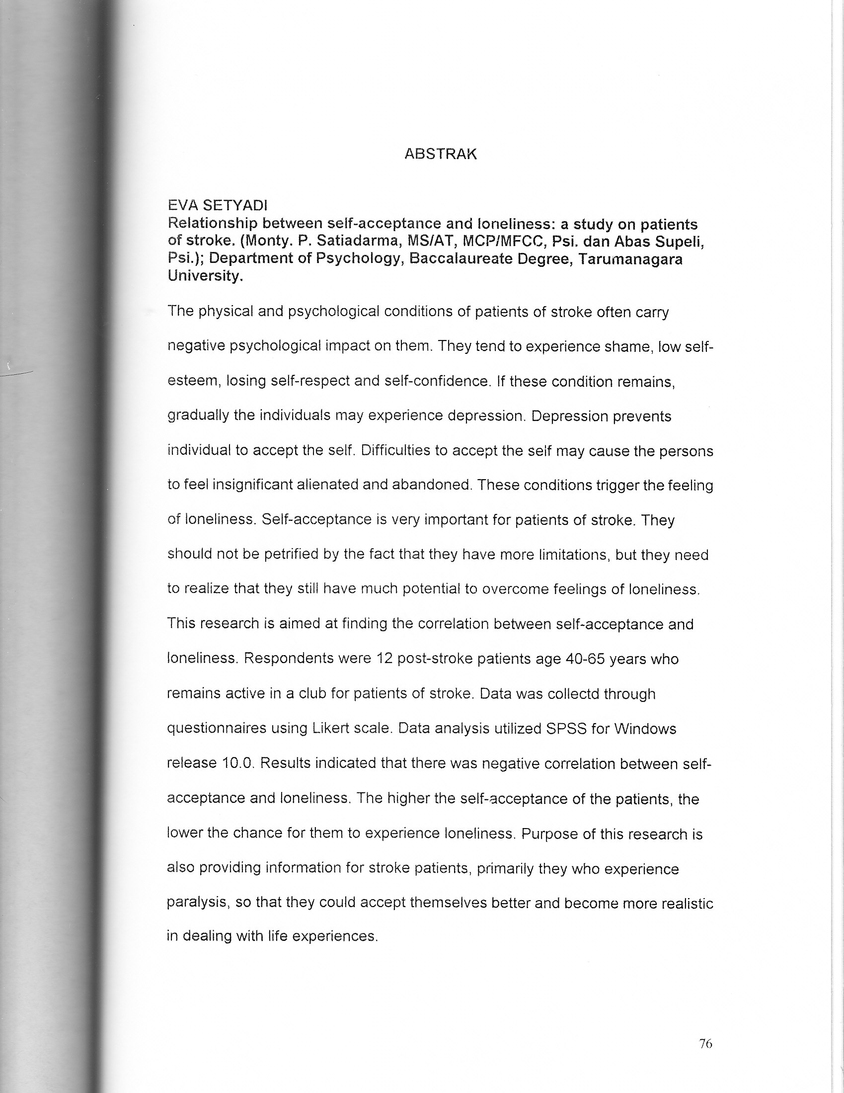 the physical and psychological conditions of patients of stroke often carry negative psychological impact on them. They tend to experience shame, low self- esteem, losing self-respect and self-confidence. lf these condition remains, gradually the individuals may experience depression. Depression prevents individual to accept the self. Difficulties to accept the self may cause the persons to feel insignificant alienated and abandoned. These conditions trigger the feeling of loneliness. Self-acceptance is very important for patients of stroke. They should not be petrified by the fact that they have more limitations, but they need to realize that they still have much potential to overcome feelings of loneliness. This research is aimed at finding the correlation between self-acceptance and loneliness. Respondents were 12 post-stroke patients age 40-65 years who remains active in a club for patients of stroke. Data was collectd through questionnaires using Likert scale. Data analysis utilized SPSS for Windows release 10.0. Results indicated that there was negative correlation between self- acceptance and loneliness. The higher the self-acceptance of the patients, the lower the chance for them to experience loneliness. Purpose of this research is also providing information for stroke patients, primarily they who experience paralysis, so that they could accept themselves better and become more realistic in dealing with life experiences.