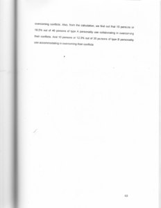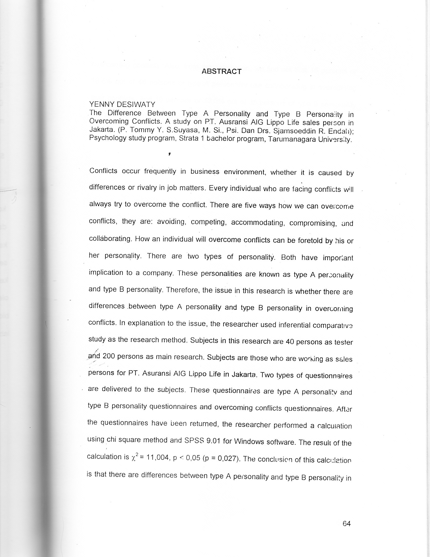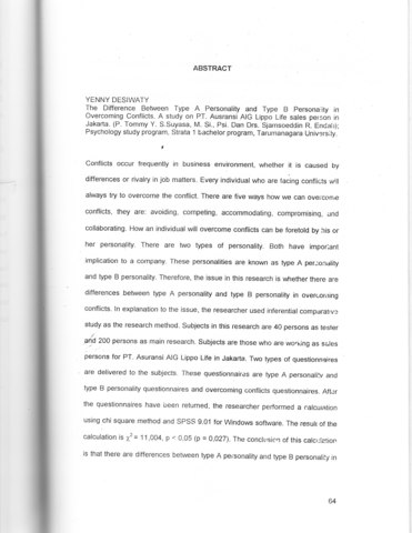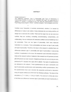Conflicts occur frequently in business environment, whether it is caused by differences or rivalry in job matters. Every individual who are facing conflicts will always try to overcome the conflict. There are five ways hOW we can overcome conflicts, they are: avoiding, competing, accommodating, compromising, and collaborating. How an individual will overcome conflicts can be foretold by his or her personality. There are two types of personality. Both have important implication to a company. These personalities are known as type A personality and type B personality. Therefore, the issue in this research is whether there are differences between type A personality and type B personality in overcoming conflicts. ln explanation to the issue, the researcher used inferential comparative study as the research method. Subjects in this research are 40 persons as tester and 200 persons as main research. Subjects are those who are working as salespersons for PT. Asuransi AIG Lippo Life in Jakarta. Two types of questionnaires are delivered to the subjects. These questionnaires are type A personality andtype B personality questionnaires and overcoming conflicts questionnaires. After the questionnaires have been returned, the researcher performed a calcutationusing _chi square method and SPSS 9.01 for Windows software. The result of the calculation is 78 = 11,004, p < 0,05 (p = 0,027). The conclusion of this calculation is that there are differences between type A personality and type B personality in overcoming conflicts. Also, from the calculation, we find out that 15 persons or 18.5% out of 46 persons of type A personality use collaborating in overcoming their conflicts. And 10 persons or 12.3% out of 35 persons of type B personality use accommodating in overcomlng their conflicts