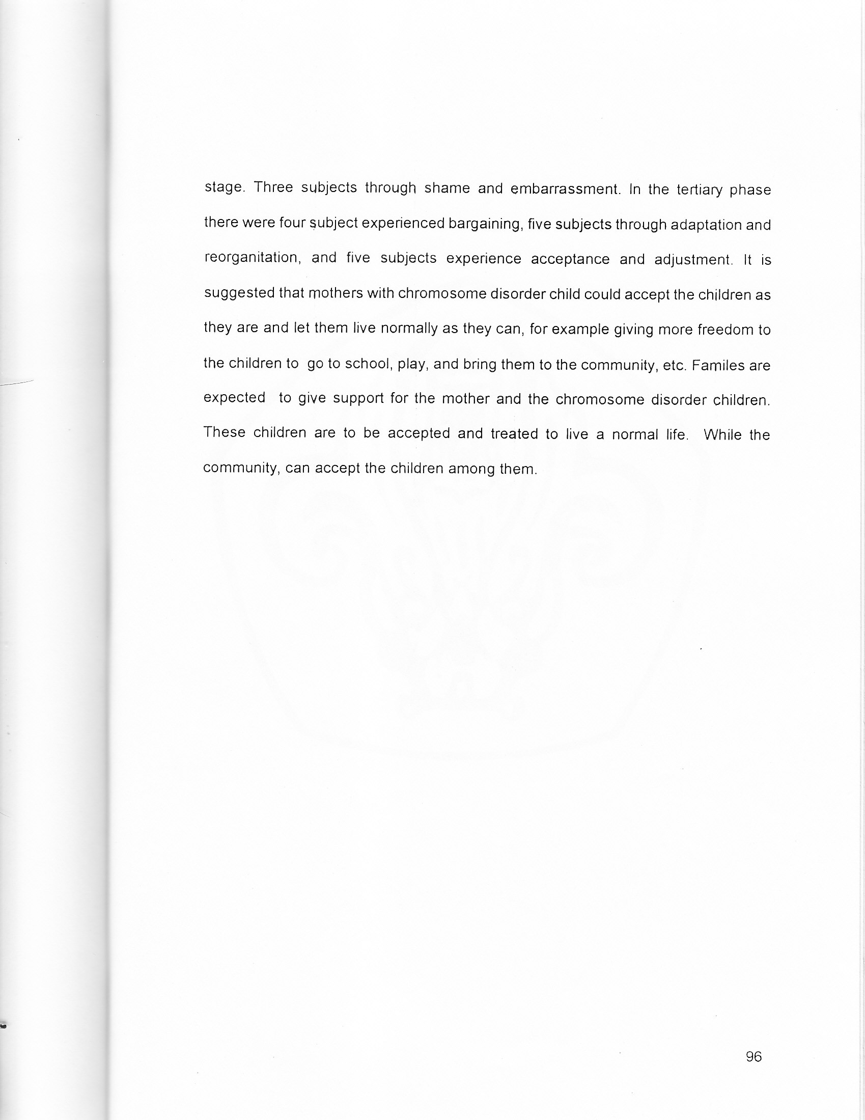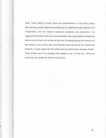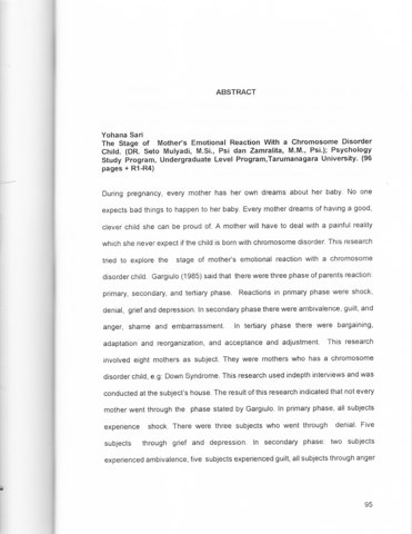 During pregnancy, every mother has her own dreams about her baby. No one expects bad things to happen to her baby. Every mother dreams of having a good, clever child she can be proud of. A mother will have to deal with a painful reality which she never expect if the child is born with chromosome disorder. This research tried to explore the stage of mothers emotional reaction with a chromosome disorder child. Gargiulo (1985) said that there were three phase of parents reaction: primary, secondary, and tertiary phase. Reactions in primary phase were shock,denial, grief and depression. ln secondary phase there were ambivalence, guilt, and anger, shame and embarrassment. ln tertiary phase there were bargaining, adaptation and reorganization, and acceptance and adjustment. This research involved eight mothers as subject. They were mothers who has a chromosome disorder child, e.g: Down Syndrome. This research used indepth interviews and was conducted at the subject's house. The result ofthis research indicated that not every mother went through the phase stated by Gargiulo. In primary phase, all subjects experience shock. There were three subjects who went through denial. Five subjects through gn'ef and depression. ln secondary phase: two subjects experienced ambivalence, five subjects experienced guilt, all subjects through anger stage. Three subjects through shame and embarrassment. In the tertiary phase there were four subjects experienced bargaining, five subjects through adaptation and reorganitation and five subject experience acceptance and adjustment. It is suggested that mothers with chromosome disorder shild could accept the children as they are and let them live normally as they can, for example giving more freedom to the children to go to school, play and bring them to the community, etc. Damilies are eexpected to give support for the mother and the chromosome disorder children. These children are to be accepted and treated to live a nomral life. While the community can accept the children among them