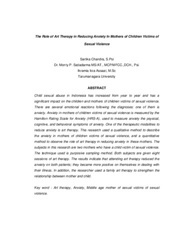 Child sexual abuse in Indonesia has increased from year to year and has a significant impact on the children and mothers of children victims of sexual violence. There are several emotional reactions following the diagnoses: one of them is anxiety. Anxiety in mothers of children victims of sexual violence is measured by the Hamilton Rating Scale for Anxiety (HRS-A), used to measure anxiety the psysical, cognitive, and behavioral symptoms of anxiety. One of the therapeutic modalities to reduce anxiety is art therapy. This research used a qualitative method to describe the anxiety in mothers of children victims of sexual violence, and a quantitative method to observe the role of art therapy in reducing anxiety in these mothers. The subjects in this research are two mothers who have a child victim of sexual violence. The technique used is purposive sampling method. Both subjects are given eight sessions of art therapy. The results indicate that attending art therapy reduced the anxiety on both patients; they became more positive on themselves in dealing with their illness. In addition, the researcher used a family art therapy to strengthen the relationship between mother and child.