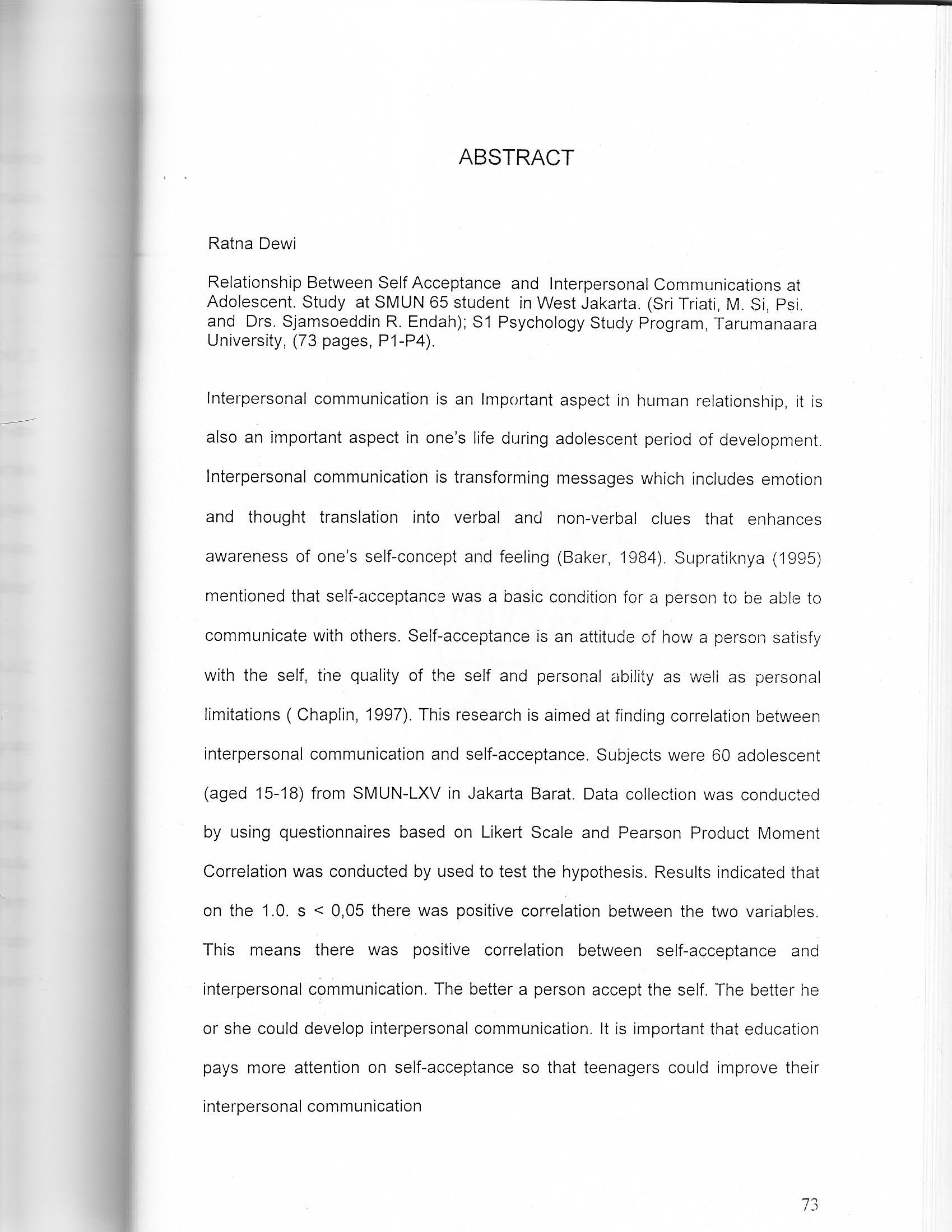 Interpersonal communication is an Important aspect in human relationship, it is also an important aspect in one's life during adolescent period of development. Interpersonal communication is transforming messages which includes emotion and thought translation into verbal and non-verbal clues that enhancesawareness of one's self-concept and feeling (Baker, 1984). Supratiknya (1995) mentioned that self-acceptance was a basic condition for a person to be able to communicate with others. Self-acceptance is an attitude of how a person satisfy with the self, the quality of the self and personal ability as well as personal limitations ( Chaplin, 1997). This research is aimed at finding correlation between interpersonal communication and self-acceptance. Subjects were 60 adolescent (aged 15-18) from SMUN-LXV in Jakarta Barat. Data collection was conducted by using questionnaires based on Likert Scale and Pearson Product Moment f Correlation was conducted by used to test the hypothesis. Results indicated that on the 1.0. s < 0,05 there was positive correlation between the two variables. This means there was positive correlation between self-acceptance and interpersonal communication. The better a person accept the self. The better he or she could develop interpersonal communication. It is important that education pays more attention on self-acceptance so that teenagers could improve their interpersonal communication