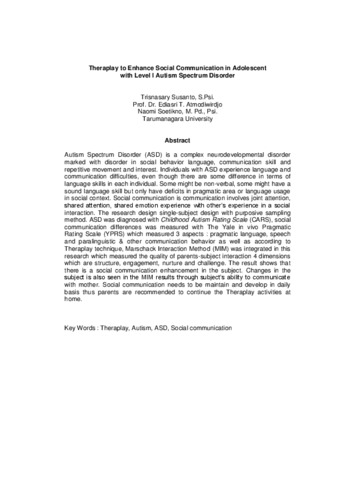 Autism Spectrum Disorder (ASD) is a complex neurodevelopmental disorder marked with disorder in social behavior language, communication skill and repetitive movement and interest. Individuals with ASD experience language and communication difficulties, even though there are some difference in terms of language skills in each individual. Some might be non-verbal, some might have a sound language skill but only have deficits in pragmatic area or language usage in social context. Social communication is communication involves joint attention, shared attention, shared emotion experience with other’s experience in a social interaction. The research design single-subject design with purposive sampling method. ASD was diagnosed with Childhood Autism Rating Scale (CARS), social communication differences was measured with The Yale in vivo Pragmatic Rating Scale (YPRS) which measured 3 aspects : pragmatic language, speech and paralinguistic & other communication behavior as well as according to Theraplay technique, Marschack Interaction Method (MIM) was integrated in this research which measured the quality of parents-subject interaction 4 dimensions which are structure, engagement, nurture and challenge. The result shows that there is a social communication enhancement in the subject. Changes in the subject is also seen in the MIM results through subject’s ability to communicate with mother. Social communication needs to be maintain and develop in daily basis thus parents are recommended to continue the Theraplay activities at home.