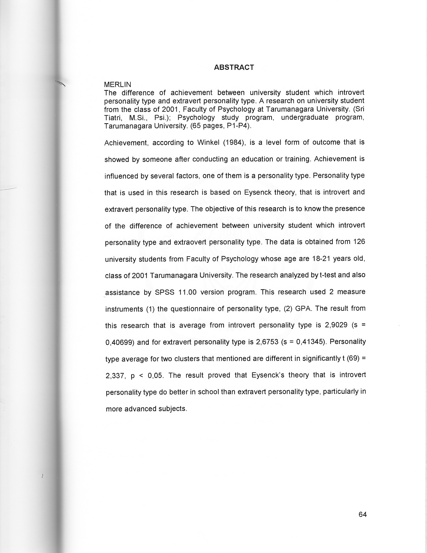 Flavor, Merlin (2002) Perbedaan prestasi belajar antara mahasiswa yang bertipe kepribadian introvert dan bertipe keperibadian ekstrovert. Skripsi thesis, Universitas Tarumanagara.