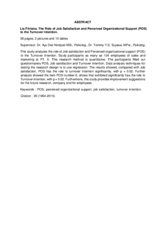 This study analyzes the role of Job satisfaction and Perceived organizational support (POS) to the Turnover intention. Study participants as many as 134 employees of sales and marketing at PT. X. This research method is quantitative. The participants filled out questionnaires POS, Job satisfaction and Turnover intention. Data analysis techniques for testing the research design is to use regression. The results showed, compared with Job satisfaction, POS has the role to turnover intention significantly, with p = 0.02. Further analysis showed the item POS number 6, shows that exhibited significantly has the role to Turnover intention, with p = 0.02. Furthermore, this study provides improvement suggestions for the future research, company and for employees.