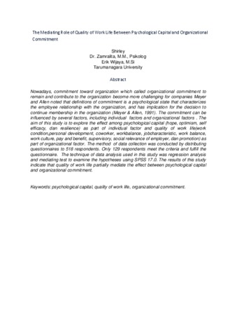Shierly, Shierly (2016) Peran psychological capital terhadap komitmen organisasional melalui kualitas kehidupan kerja sebagai mediator. Masters thesis, Universitas Tarumanagara.