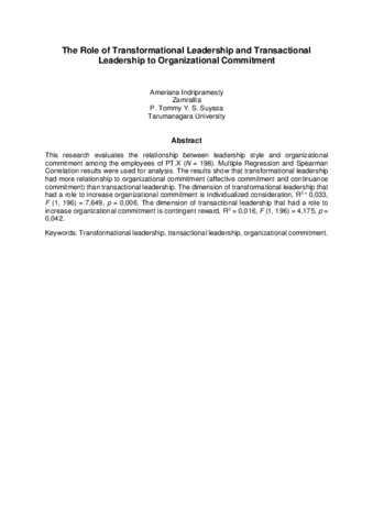 This research evaluates the relationship between leadership style and organizational commitment among the employees of PT.X (N = 198). Multiple Regression and Spearman Correlation results were used for analysis. The results show that transformational leadership had more relationship to organizational commitment (affective commitment and continuance commitment) than transactional leadership. The dimension of transformational leadership that had a role to increase organizational commitment is individualized consideration, R2 = 0,033, F (1, 196) = 7,649, p = 0,006. The dimension of transactional leadership that had a role to increase organizational commitment is contingent reward, R2 = 0,016, F (1, 196) = 4,175, p = 0,042.