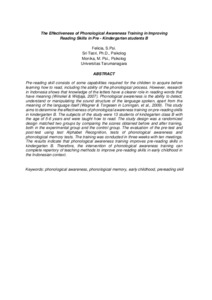 Pre-reading skill consists of some capabilities required for the children to acquire before learning how to read, including the ability of the phonological process. However, research in Indonesia shows that knowledge of the letters have a clearer role in reading words that have meaning (Winskel & Widjaja, 2007). Phonological awareness is the ability to detect, understand or manipulating the sound structure of the language spoken, apart from the meaning of the language itself (Wagner & Torgesen in Loningan, et al., 2009). This study aims to determine the effectiveness of phonological awareness training on pre-reading skills in kindergarten B. The subjects of the study were 13 students of kindegarten class B with the age of 5-6 years and were taught how to read. The study design was a randomized design matched two groups by comparing the scores obtained before and after training, both in the experimental group and the control group. The evaluation of the pre-test and post-test using test Alphabet Recognition, tests of phonological awareness and phonological memory tests. The training was conducted in three weeks with ten meetings. The results indicate that phonological awareness training improves pre-reading skills in kindergarten B. Therefore, the intervention of phonological awareness training can complete repertory of teaching methods to improve pre-reading skills in early childhood in the Indonesian context.