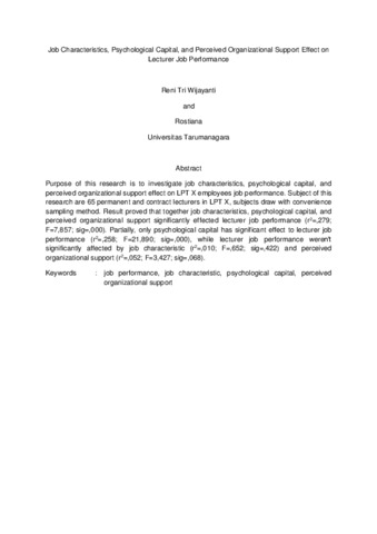 Purpose of this research is to investigate job characteristics, psychological capital, and perceived organizational support effect on LPT X employees job performance. Subject of this research are 65 permanent and contract lecturers in LPT X, subjects draw with convenience sampling method. Result proved that together job characteristics, psychological capital, and perceived organizational support significantly effected lecturer job performance (r2=,279; F=7,857; sig=,000). Partially, only psychological capital has significant effect to lecturer job performance (r2=,258; F=21,890; sig=,000), while lecturer job performance weren’t significantly affected by job characteristic (r2=,010; F=,652; sig=,422) and perceived organizational support (r2=,052; F=3,427; sig=,068).