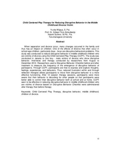 When separation and divorce occur, many changes occurred in the family and thus has an impact on children. One of the effects of divorce that often occur in school-age children, particularly boys - boys are disruptive behavioral problems. This study was conducted to reduce disruptive behavior in middle childhood children who are victims of divorce using the Child Centered Play Therapy (CCPT). The study was conducted in Jakarta to one boy - male victims of divorce who show disruptive behavior. Interviews and therapy conducted by researchers from August to December 2012. Researchers used a Disruptive Behavior Checklist before and after treatment to measure the frequency of the emergence of disruptive behavior of participants. Through CCPT, participants are free to express and explore thoughts, feelings, experiences, and behaviors. Thus, reduced frustration within and through reflection therapist allows participants to move from disruptive behavior to a more effective functioning. After 12 session therapy sessions, participants were more aware that their behavior is disturbing for other people so that participants were better able to control their disruptive behavior both at school and at home. CCPT seen to be effective in reducing disruptive behavior in middle childhood children who are victims of divorce based on Disruptive Behavior Checklist were administered after therapy than before therapy