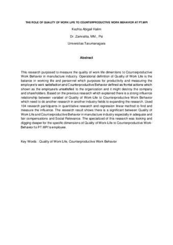 Abigail Halim, Kezhia (2016) Peranan dimensi kualitas kehidupan kerja terhadap perilaku kerja kontraproduktif pada PT. MPI. Masters thesis, Universitas Tarumanagara.