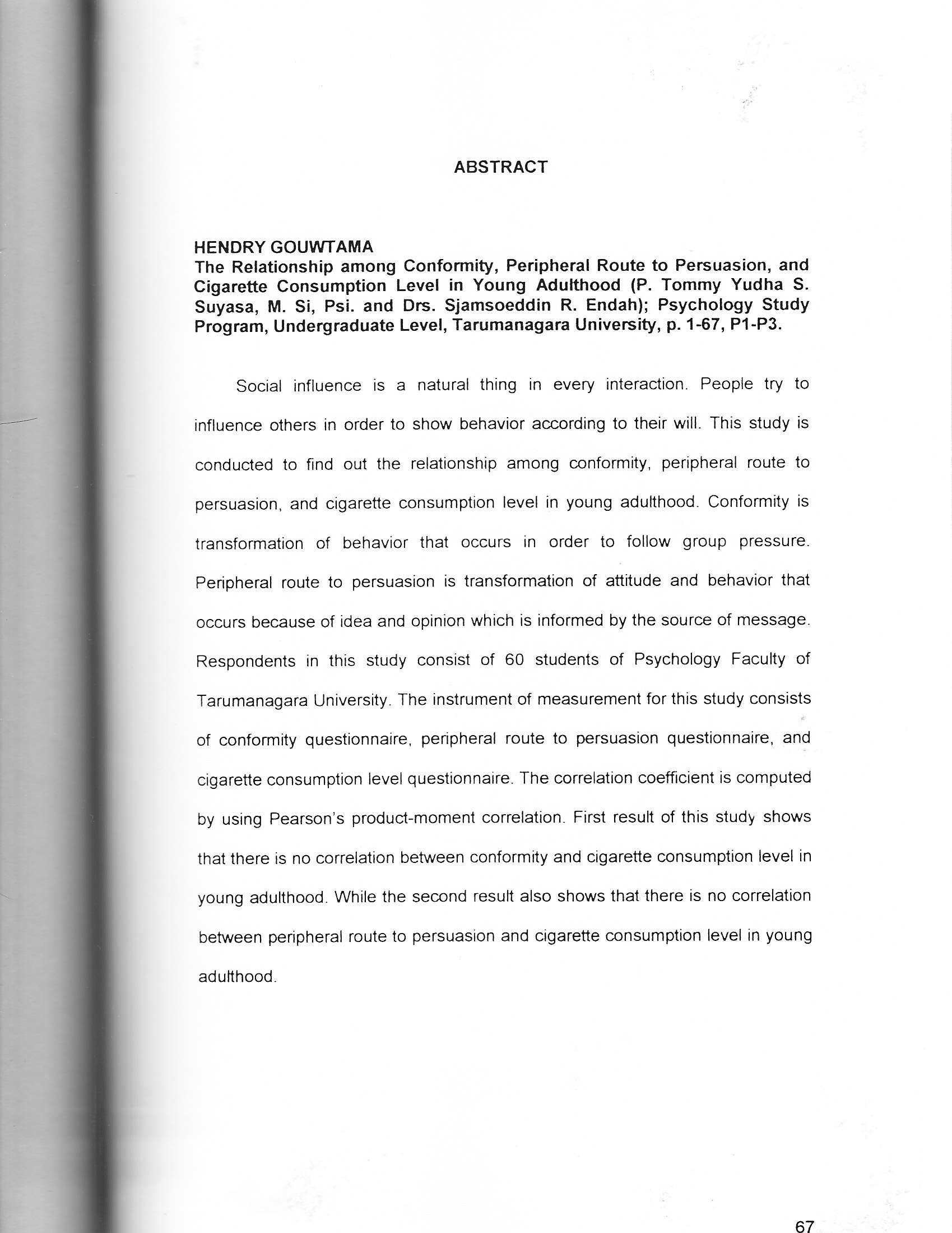 Gouwtama, Hendry (2003) Hubungan antara konformitas dan persuasi jalur peripheral terhadap level pengkonsumsian rokok pada dewasa muda. Skripsi thesis, Universitas Tarumanagara.