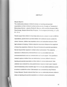 Parents expect their children to have high achievement a school. in order to fulfill the expectations, parents tend to provide children with additional courses outside the school. However, children may experience stress and exhaustion because of their tight schedule of studying. Children subjective impression influences the magnitude of stress they experience. Moreover, they are threatened by parental expectations that are beyond their capacity to conduct school achievement. The subjective impression is influenced by individual factors such as personality factor and environmental factors such as communication and social support. This quantitative research explores whether there are relationships between children's stress on learning and parental expectation on their children's school achievement. Data collection was conducted by using questionnaires based on Likert scale. Subjects were 40 elementary school students (age 10-12)vvho also attend additional courses at school or outside the school. Data analysis was conducted by using Pearson Product Moment. Results indicated that there was no relationship between children's stress on learning and parental expectation on children's school achievement.