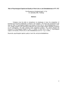 "Company must be able to strengthens its employees to face the competition of business and convince employees to remain in the company. The study was conducted to see how the Role of Psychological Capital and Quality of Work Life on Job Embeddedness in PT. XYZ. Design research with quantitative approach and using simple random sampling consisting of 217 participants. The data analysis using regression analysis. The results showed the influence of Psychological Capital is 28.2 %, Quality of Work Life is 25.9 %, Psychological Capital and Quality of Work Life on Job Embeddedness are 40.1 % (p = 0.000).