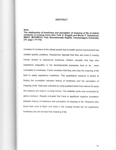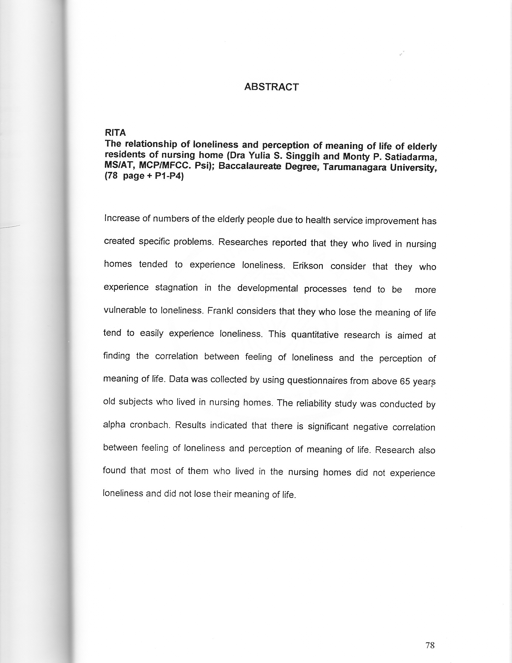 Rita, Rita (2003) Hubungan antara kesepian dengan persepsi makna hidup pada penghuni panti werda. Skripsi thesis, Universitas Tarumanagara.