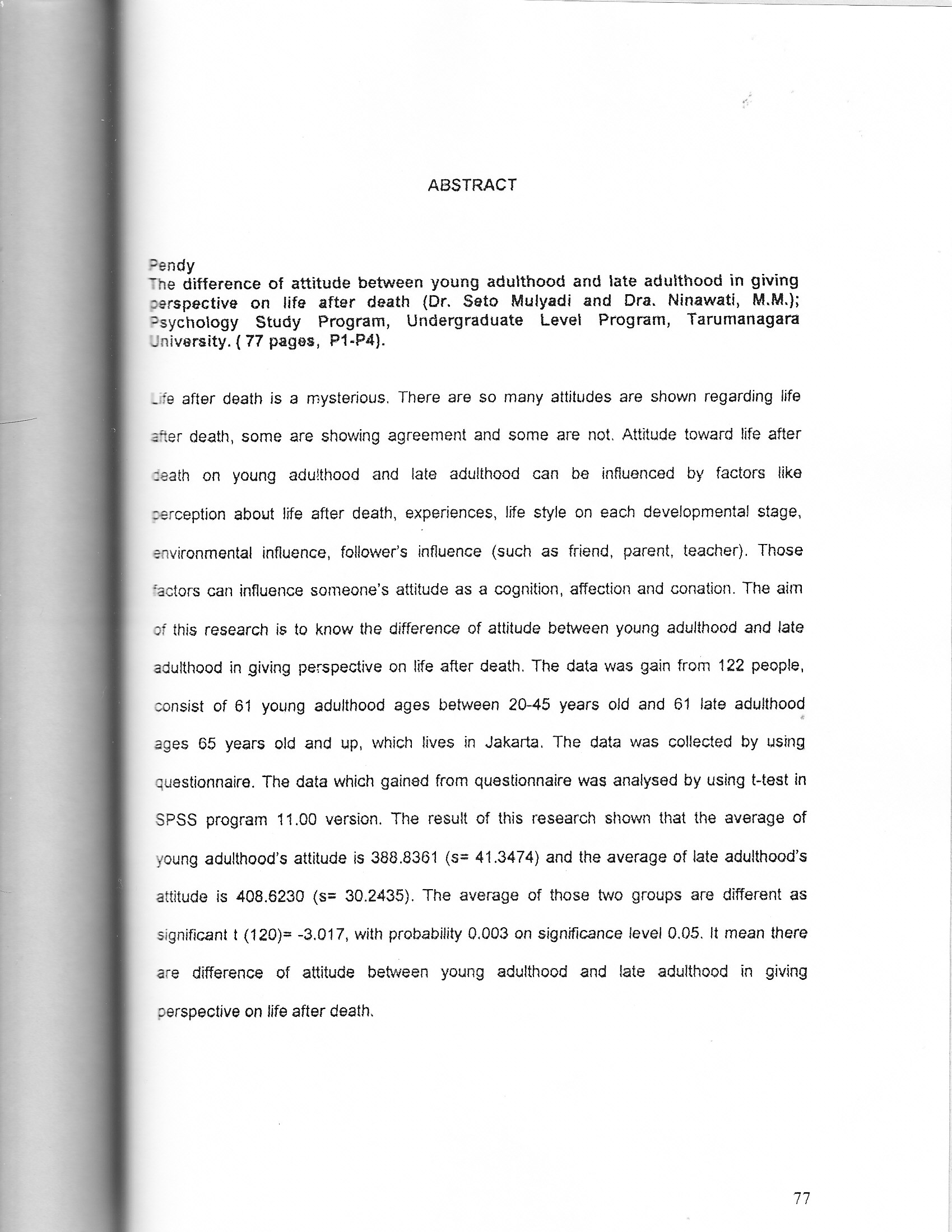 Life after death is a mysterious. There are so many attitudes are shown regarding life atter death, some are showing agreement and some are not. Attitude toward life after death on young aduithood and late adulthood can be infiuenced by factors like perception about life after death, experiences, life style on each developmental stage, environmental influence, follower's influence (such as friend, parent, teacher). Those actors can influence someone's attitude as a cognition, affection and conation. The aim of this research ie to know the difference of attitude between young adulthood and late adulthood in giving perspective on life after death. The data was gain from 122 people. consist of 61 young adulthood ages between 20-45 years old and 61 late adulthood ages 65 years old and up, which lives in Jakarta. The data was collected by using questionnaire. The data which gained from questionnaire was analysed by using t-test in SPSS program 11.00 version. The result of this research shown that the average of young adulthood's attitude is 388.8361 (S: 41 .3474) and the average of late adulthood's attitude is 4085230 (s= 302435). The average of those two groups are different as significant ‘(120)= -3.017, with probabillity 0.003 on significance level 0.05. it means there are difference of attitude between young adulthood and late adulthood in giving perspective life after death.