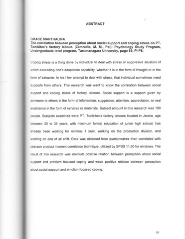 Marthalina, Grace (2003) Hubungan antara persepsi mengenai dukungan sosial dengan coping stress pada buruh pabrik PT Tonikitex. Skripsi thesis, Universitas Tarumanagara.