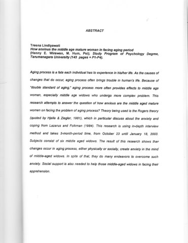 Lindiyawati, Tresna (2003) Kecemasan wanita dewasa madya yang hidup menjanda dalam menghadapi masa penuaan. Skripsi thesis, Universitas Tarumanagara.