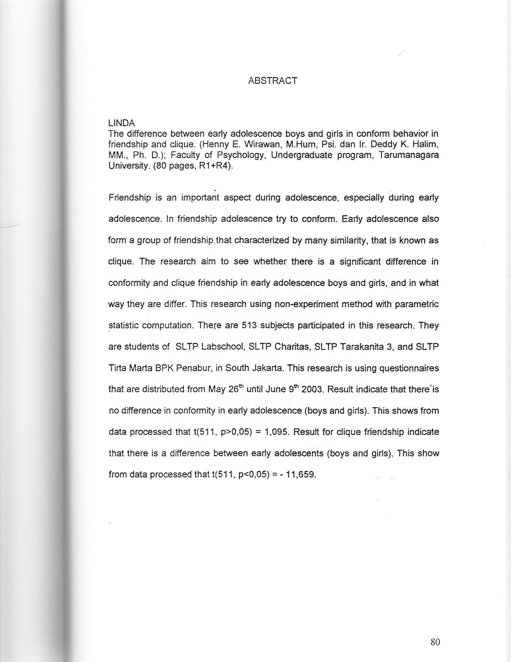 Linda, Linda (2003) Perbedaan remaja awal laki-laki dan perempuan dalam perilaku conform pada pertemanan dan clique. Skripsi thesis, Universitas Tarumanagara.