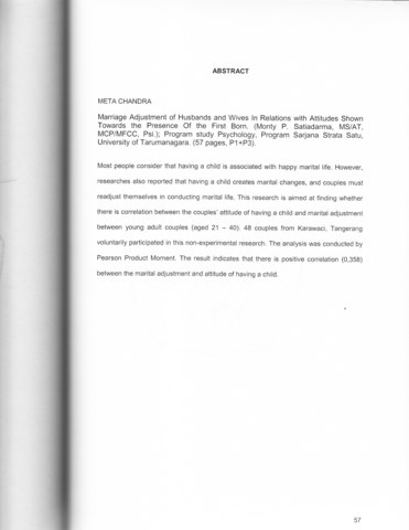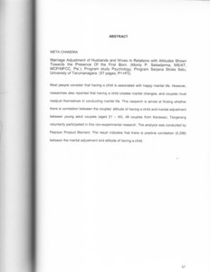 Chandra, Meta (2004) Penyesuaian perkawinan pasangan suami istri & hubungan dengan sikap terhadap kehadiran anak pertama. Skripsi thesis, Universitas Tarumanagara.