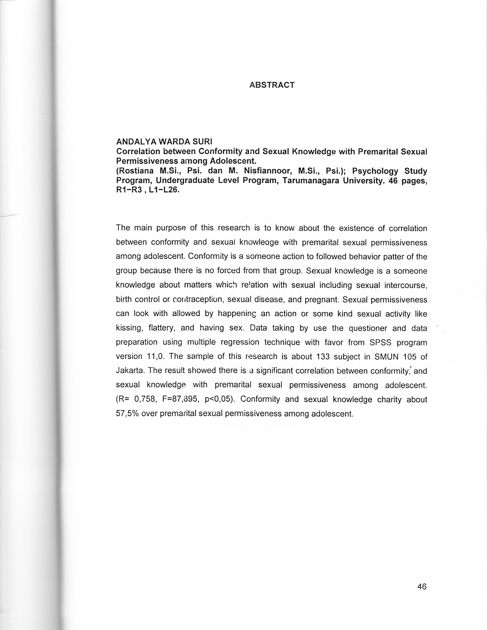 S., Andalya W. (2004) Hubungan antara konformitas dan pengetahuan seksual dengan permisivitas perilaku seksual pranikah pada remaja. Skripsi thesis, Universitas Tarumanagara.