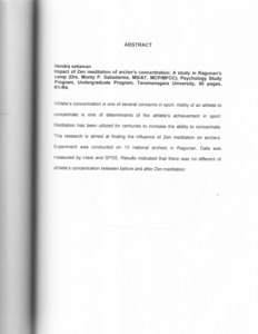 Athlete's concentration is one of several concerns in sport. Ability of an athlete to concentrate is one of determinants of the athlete's achievement in sport. Meditation has been utilized for centuries to increase the ability to concentrate. This research is aimed at finding the influence of Zen meditation on archers. Experiment was conducted on 10 national archers in Ragunan. Data was measured by t-test and SPSS. Results indicated that there was no different of athlete's concentration between before and after Zen meditation.
