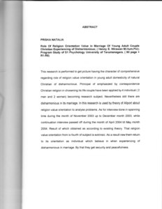 Natalia, Priska (2004) Peranan orientasi nilai religius dalam pernikahan pasangan dewasa muda Kristen yang mengalami ketidakharmonisan. Skripsi thesis, Universitas Tarumanagara.