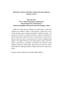 Children with autism spectrum disorder show limited ability in social skills therefore had a problems to adjust in social situations. Social story is one of method have been used to improved social skills for children with autism. The purpose of this study is to evaluate the effect of social story intervention to improve social skills in children with autism in school setting. A social story was given by written story with text and pictorial cues or photos to explained social situation. This studies involved a boy with autistic aged 10 years 3 month with deficit in social skills as a partisipant. The method of this research is quasi experiment design with single subject. Result found that social story had no positive effect on improving social skills in children with autism in a regular school setting.