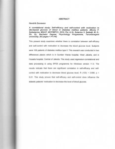 This present study examines whether there is correiatiort between seif-efiicacyand sed-control with motivation to decrease the blood glucose tevei. Subieets were 106 patients of diabetes mellitus type ll. This reseach was conducted in two differences places which is in Sumber Waras hospital, West Jakarta, and in Husada hospital, Central of Jakarta. This study used regression-correlational and data processing is using SPSS programme for Windows version 11.0. The results indicate that there are significant corretation in self-eft'icacy and self- control with motivation to decrease biood giucose ievei, R (103) = 8.698, e 0.01. This study proves that self-efficiacy and self-control does influence the diabetic patient's motivation to decrease the level of blood glucosure"