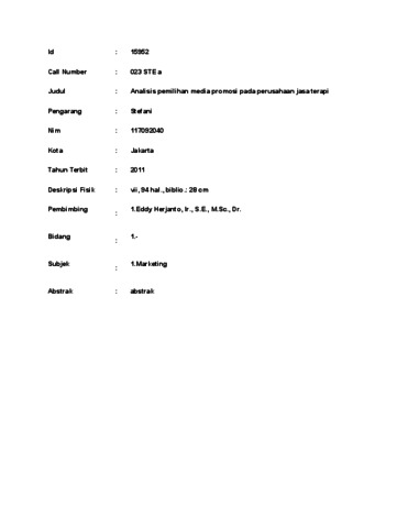 Stefani, Stefani (2011) Analisis pemilihan media promosi pada perusahaan jasa terapi. Masters thesis, UNIVERSITAS TARUMANAGARA.