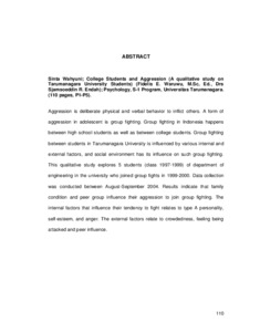 Aggression is deliberate physical and verbal behavior to inflict others. A form of aggression in adolescent is group fighting. Group fighting in Indonesia happens between high school students as well as between college students. Group fighting between students in Tarumanagara University is influenced by various internal and external factors, and social environment has its influence on such group fighting. This qualitative study explores 5 students (class 1997-1999) of department of engineering in the university who joined group fights in 1999-2000. Data collection was conducted between August-September 2004. Results indicate that family condition and peer group influence their aggression to join group fighting. The internal factors that influence their tendency to fight relates to type A personality, self-esteem, and anger. The external factors relate to crowdedness, feeling being attacked and peer influence.