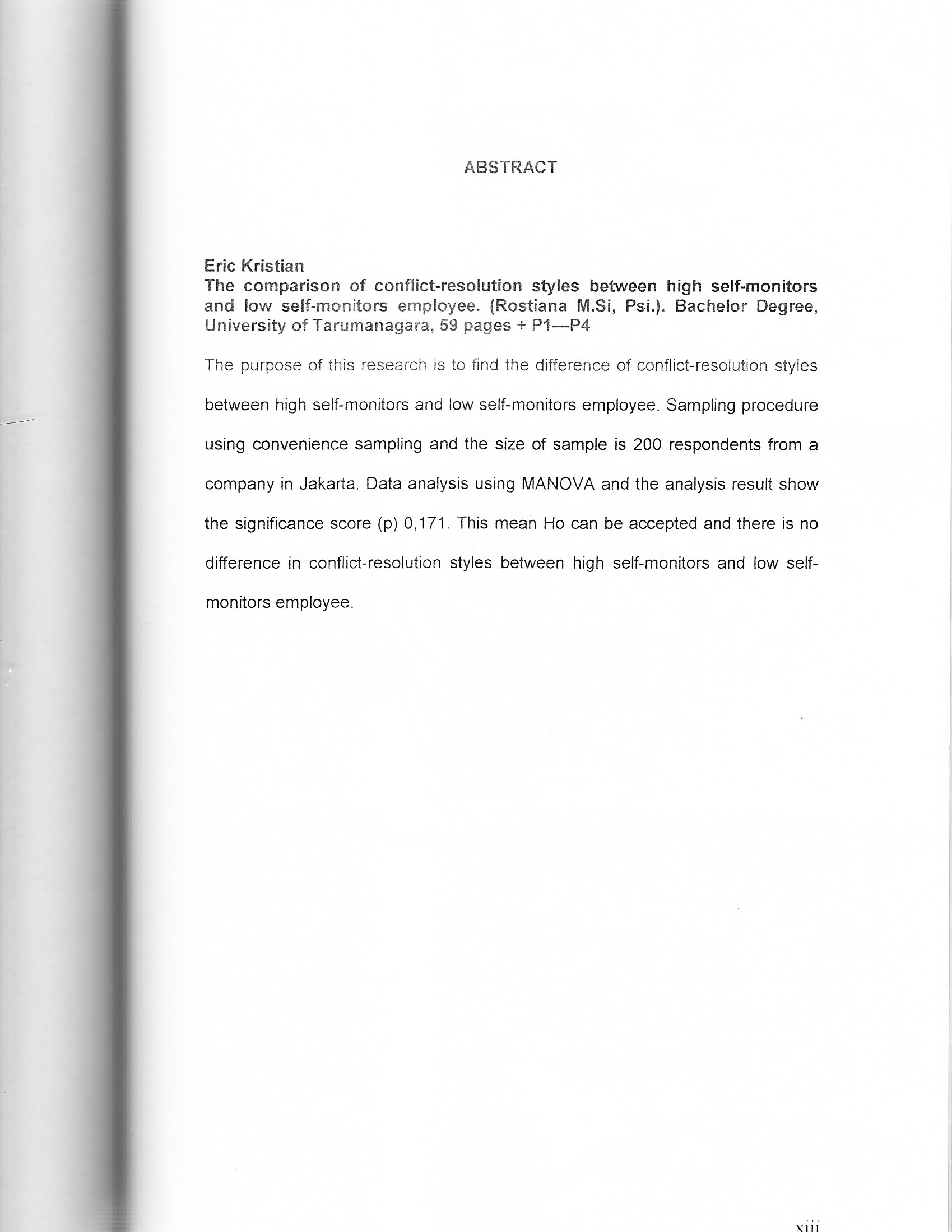 Kristian, Eric (2005) Perbandingan gaya resolusi konflik antara karyawan dengan tingkat self monitoring tinggi dan tingkat self monitoring rendah. Skripsi thesis, Universitas Tarumanagara.