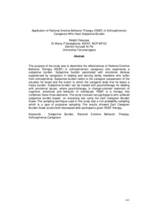 The purpose of the study was to determine the effectiveness of Rational Emotive Behavior Therapy (REBT) in schizophrenia's caregivers who experience a subjective burden. Subjective burden associated with emotional distress experienced by caregivers in helping and serving family members who suffer from schizophrenia. Subjective burden refers to the caregiver assessment of the situation he faced and the extent to which the caregiver feels that he bears a heavy burden. Subjective burden can be treated with psychotherapy for dealing with emotional issues, where psychotherapy is change-oriented treatment of cognitive, emotional and behavior of individuals. REBT is a therapy that combines these three elements. The study involved two participants who suffered subjective burden based on screening test using the Zarit Caregiver Burden Scale. The sampling technique used in this study was a non-probability sampling which is a type of purposive sampling. The results showed Zarit Caregiver Burden Scale scores both decreased after participants given REBT therapy.