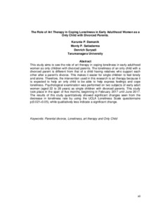 This study aims to see the role of art therapy in coping loneliness in early adulthood women as only children with divorced parents. The loneliness of an only child with a divorced parent is different from that of a child having relatives who support each other after a parent's divorce. This makes it easier for single children to feel lonely and alone. Therefore, the intervention used in this research is art therapy because it is expected to help an only child to be able to help express feelings and cope loneliness. Psychological examination was performed on two subjects of early adult women (aged 22 to 28 years) as single children with divorced parents. This study took place in the span of five months, beginning in February 2017 until June 2017. The results of this study quantitatively showed significant changes seen from the decrease in loneliness rate by using the UCLA Loneliness Scale questionnaire p(0.021<0.05), while qualitatively less indicate a significant change.