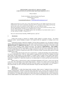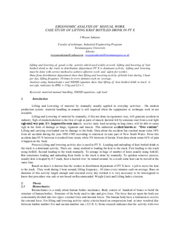 Sukania, I Wayan ERGONOMIC ANALYSIS OF MANUAL WORK CASE STUDY OF LIFTING KRAT BOTTLED DRINK IN PT X. Karya Ilmiah Dosen.