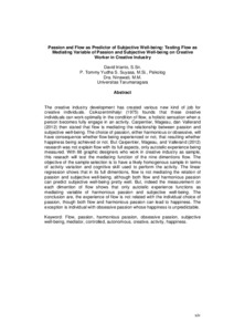 Irianto, David (2014) Harmonious passion dan flow sebagai prediktor subjective well-being pengujian fungsi flow sebagai mediator antara passion dan subjective well-being pada pekerja kreatif di industri kreatif. Masters thesis, Universitas Tarumanagara.