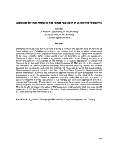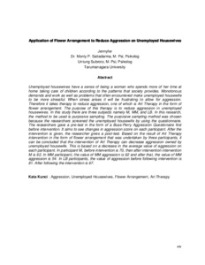 Unemployed housewives have a sense of being a woman who spends more of her time at home taking care of children according to the patterns that society provides. Monotonous demands and work as well as problems that often encountered make unemployed housewife to be more stressful. When stress arises it will be frustrating to allow for aggression. Therefore it takes therapy to reduce aggression, one of which is Art Therapy in the form of flower arrangement. The purpose of this therapy is to reduce aggression in unemployed housewives. In this study there are three subjects namely M, MM, and LB. In this research, the method to be used is purposive sampling. The purposive sampling method was chosen because the researchers screened the unemployed housewife by using the questionnaire. The researchers gave a pre-test in the form of a Buss-Perry Aggression Questionaire first before intervention. It aims to see changes in aggression score on each participant. After the intervention is given, the researcher gives a post-test. Based on the result of Art Therapy intervention in the form of flower arrangement that was undertaken by three participants, it can be concluded that the intervention of Art Therapy can decrease aggression owned by unemployed housewife. This is based on a decrease in the average value of aggression on each participant. In participant M, before intervention is 70, then after intervention intervention M is 62. In MM participant, the value of MM aggression is 62 and after that, the value of MM aggression is 54. In LB participants, the value of aggression before following intervention is 81. After following the intervention is 67