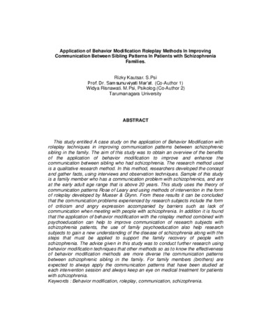 This study entitled A case study on the application of Behavior Modification with roleplay techniques in improving communication patterns between schizophrenic sibling in the family. The aim of this study was to obtain an overview of the benefits of the application of behavior modification to improve and enhance the communication between sibling who had schizophrenia. The research method used is a qualitative research method. In this method, researchers developed the concept and gather facts, using interviews and observation techniques. Sample of this study is a family member who has a communication problem with schizophrenics, and are at the early adult age range that is above 20 years. This study uses the theory of communication patterns Rose of Leary and using methods of intervention in the form of roleplay developed by Mueser & Glynn. From these results it can be concluded that the communication problems experienced by research subjects include the form of criticism and angry expression accompanied by barriers such as lack of communication when meeting with people with schizophrenia. In addition it is found that the application of behavior modification with the roleplay method combined with psychoeducation can help to improve communication of research subjects with schizophrenia patients, the use of family psychoeducation also help research subjects to gain a new understanding of the disease of schizophrenia along with the steps that must be applied to support the family recovery of people with schizophrenia. The advice given in this study was to conduct further research using behavior modification techniques that other methods so as to know the effectiveness of behavior modification methods are more diverse the communication patterns between schizophrenic sibling in the family. For family members (brothers) are expected to always apply the communication patterns that have been studied at each intervention session and always keep an eye on medical treatment for patients with schizophrenia.